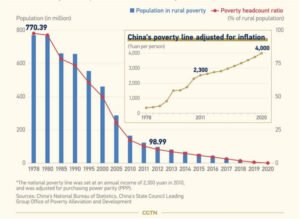 طی 40 سال گذشته، تعداد افرادی که در چین درآمد کمتر از 1.90 دالر در روز دارند – خط فقر بین المللی که توسط بانک جهانی برای ردیابی فقر شدید جهانی تعریف شده است – نزدیک به 800 میلیون نفر کاهش یافته است. با این کار، چین نزدیک به سه چهارم کاهش جهانی تعداد افرادی که در فقر شدید زندگی می کنند، داشته است. در خط فقر ملی فعلی چین، تعداد فقرا در مدت مشابه 770 میلیون کاهش یافت.