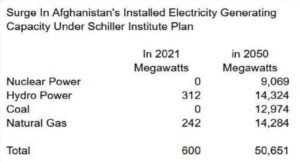 First, that electricity must be produced. Based on the technological capability of the selected electricity-generating power source, and as well, its suitability to Afghanistan, and the type of resources Afghanistan has, the Schiller Institute projects Afghanistan’s electricity to be produced in 2050 on the following distribution basis: 27% produced by nuclear power; 25% by coal; 25% by natural gas; and 23% by hydro power.