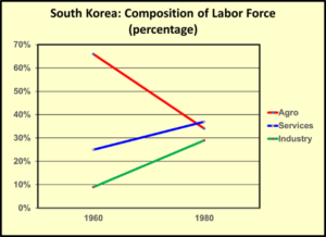 Back in 1960, South Korea was a classically underdeveloped country, with 66% of its labor force in the agricultural sector, and only 9% in industry. It ranked 31st in the world in terms of GDP – which is an admittedly inadequate measure of real economic growth, which we use only for comparative purposes here. Twenty years later, South Korea was able to shift employment out of agriculture principally into industry, to the point that 29% of its labor force was in the industrial sector as of 1980 – more than tripling the 1960 percentage. With this dramatic shift towards industrialization, South Korea is today ranked 13th in the world in GDP.